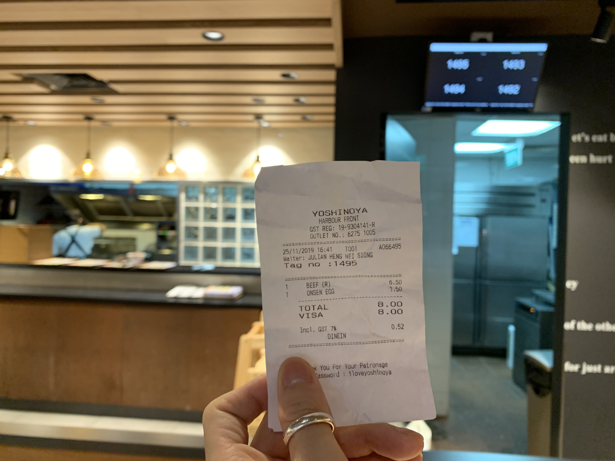 今回は牛丼$6.5と温泉卵$1.5を頼みました。味噌汁は無料でついてきました。サービスチャージ10%とGST7%はかかりませんでした。たまたまだったのか、全体的にそうかは分かりませんが、レジをやってくれていた店員さんはケータイでワッツアップでチャットをしつつテキトーな感じでした😢購入後はレシートに書かれたタグナンバーを教えられ、完成すると呼びベルが鳴り、セルフサービスで取りに行きます。