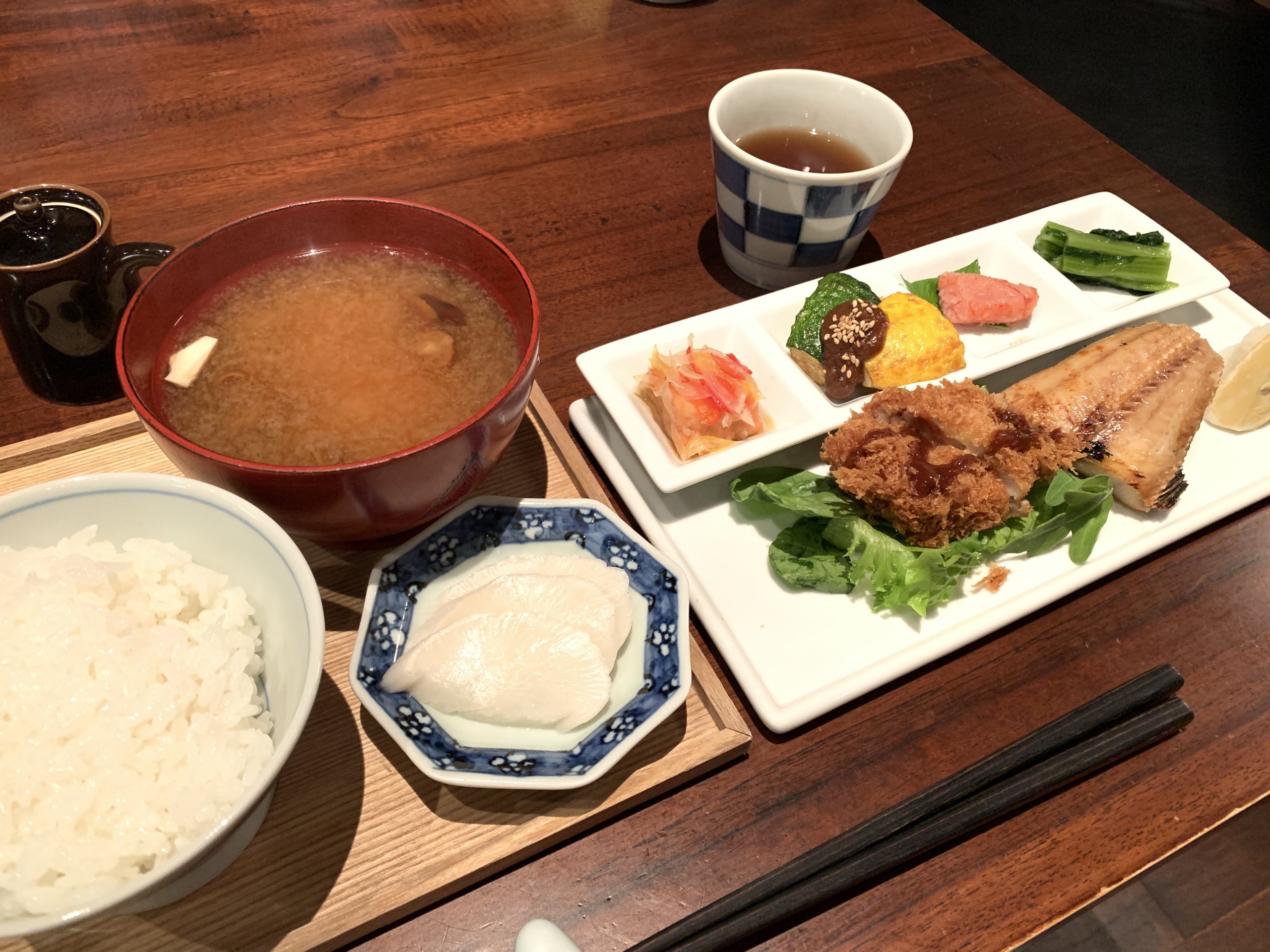酢重新米セットの到着。ご飯、なめこの味噌汁、漬物、鶏カツ、ほっけ焼き、マリネ、ズッキーニの味噌和え、明太子、野沢菜となっています。これはかなり食べ応えあり👍幕内定食とも言えるかもしれません😚