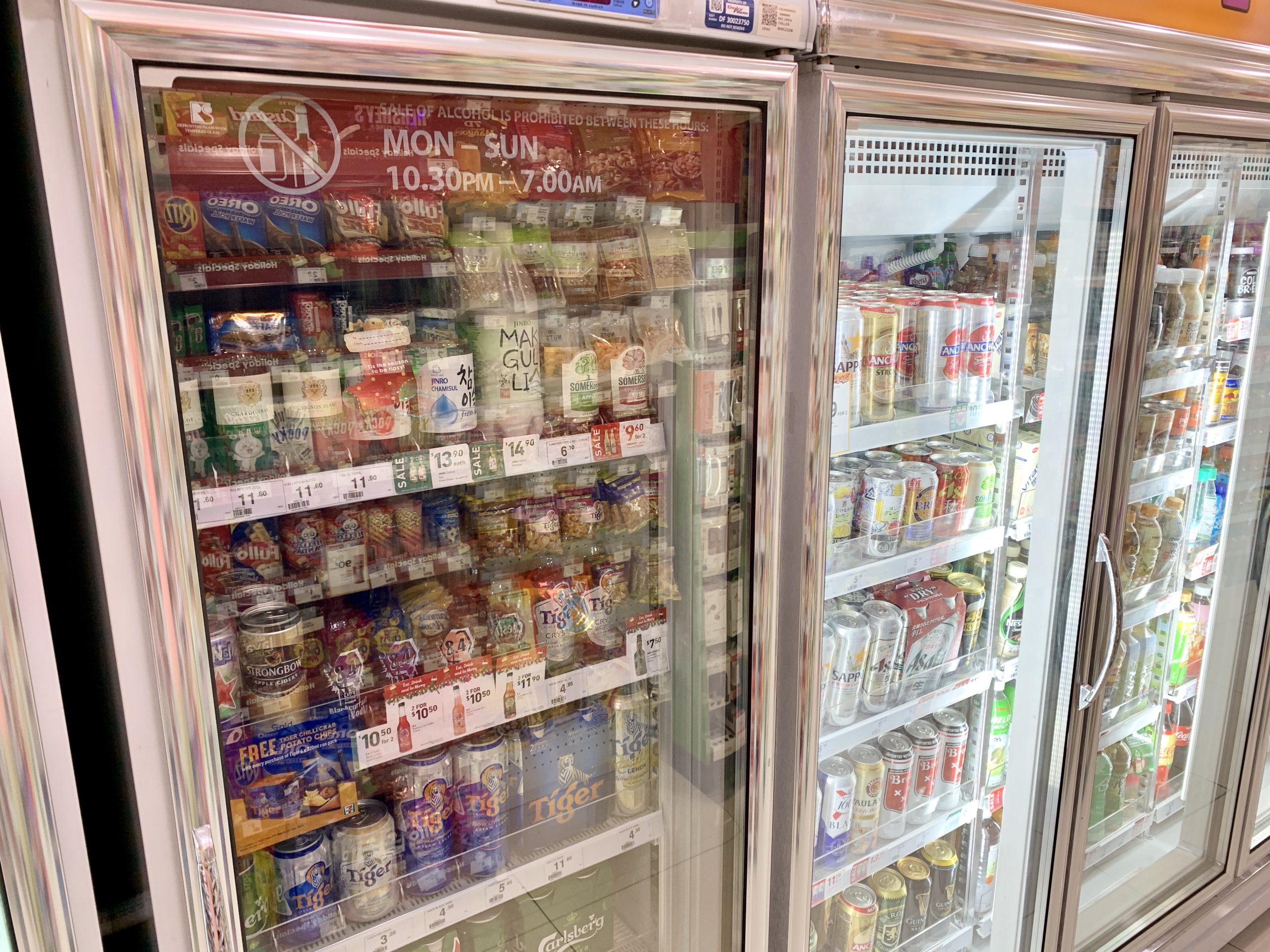 そしてこれがシンガポール🇸🇬22:30-7:00までの間はアルコール類の購入ができません。セブンイレブンに限らずどのコンビニ、スーパーでも販売が禁止されています‼️お店の冷蔵庫にはチェーンが巻かれ鍵がかけられていたりもします。