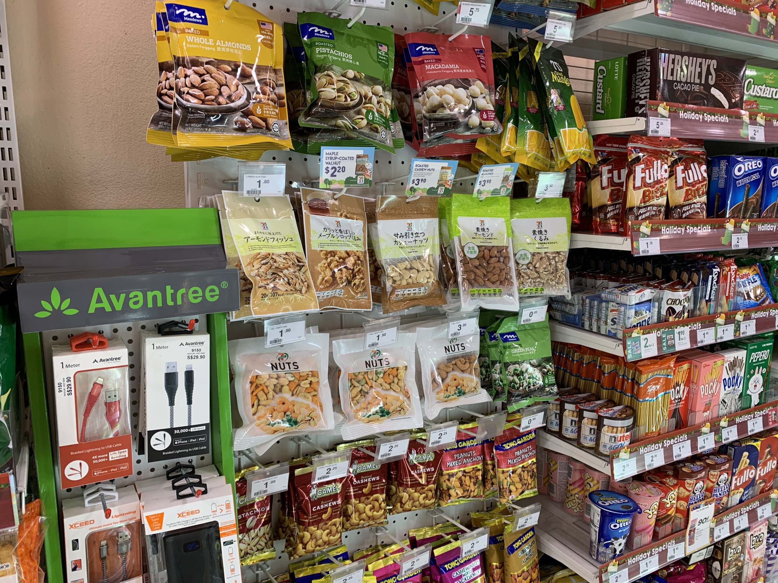 セブンイレブンオリジナルの商品は日本語表記のまま陳列されています。お酒のお供系のものもあれば、チョコやスナックなどのオリジナル商品もあります‼️