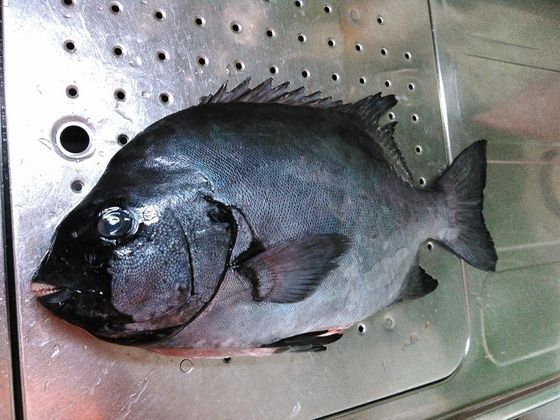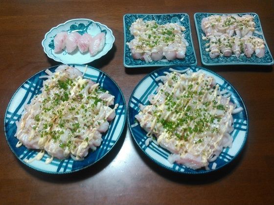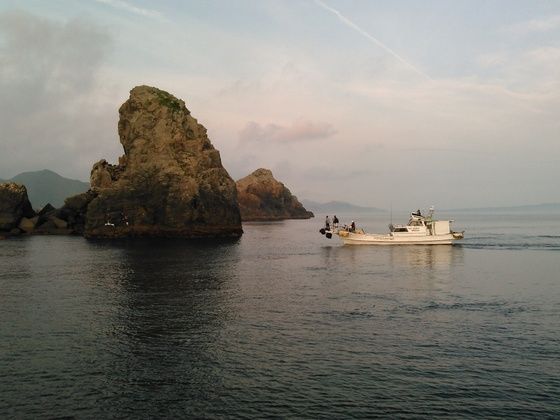 6月11日(土)五島釣行 6月11日(土) 久しぶりに五島に行ってきましたなんやかんやで釣りに行けず・・・・先週、いつもの波止に行くも不発週初めは天気予報は雨・・・・・また行けないかな~~~~と思っていたら週末近くに日帰り出来そうな天気に段取りして、いつもの貨物船に乗り込み福江を目指しますAM5:10福江港に到着渡船はいつもお世話になっているOYAZIMARU http://oyazimaru.com/です今回は南の風が吹きウネリがつくかもしれないとの事で鴨、ホゲ島を目指しますここではクロ釣りはした事はありますが、底物は初挑戦です今回の釣り場です。初めての磯はワクワクしますね~~~~瀬上がりした時に潮が引いていたので、磯に付いてるカラス貝を取り撒き餌をしてから準備を始め釣り開始します足元から探りアタリがないのでドンドン深場を探っていきます・・・・がアタリがありません少し場所を移動して狙ってみますが、そこもダメな~~~~~~んも無く終了しましたターミナルに着くとコンカナさんhttp://blogs.yahoo.co.jp/ytwnj313からうれしいお土産を頂きました2kg程の本石です炙り寿司61貫 娘と握って美味しく頂きましたコンカナさんご馳走様でした