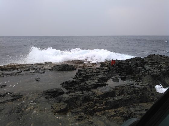 段々と潮があがてきて磯に当たった波が暴風に乗ってバシャバシャバシャとかぶります。