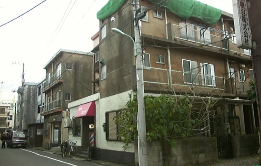 写真右の道路は清州橋通り沿いにあった5号館の横から南へ入る横丁。右奥が清州橋通りの方向。南翼折り返し部分の外側を見ている。道路際に張り出している白い部分は増築したもので、昭和50年ごろの工事になるのではないかと思う。