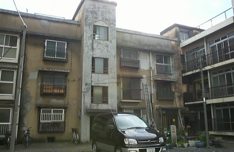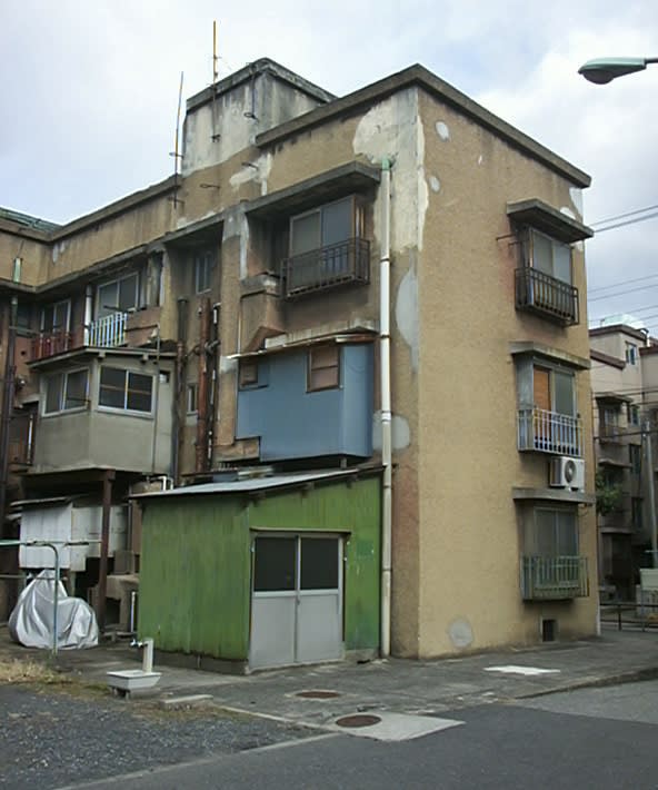 中央と左の階段室から左側は前面に増築している。増築部分の壁は階段室の壁に合わせているが庇はそれより前に出てしまっている。6世帯共同での工事らしいが、誰が許可するのだろう。暗黙の了解か?