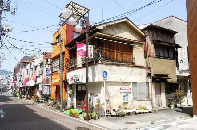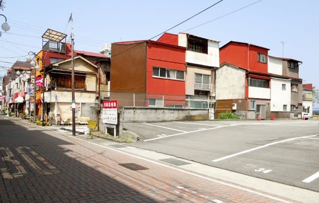 写真左のレンガ舗装の通りが「なぎさ中通り」という渚町(なぎさちょう)のメインストリートで、その糸川と初川の間である。飲み屋街の家並みが駐車場で切れてしまっている。昔はその駐車場にも小料理屋やスナックなんかが立ち並んでいたのだろうか? 駐車場に裏側を見せる家並みの表側は路地で、両側に飲み屋が並んでいるわけだが、この路地では営業している店は半分もないようだ。家は簡単な造りなのに三階を増築している。