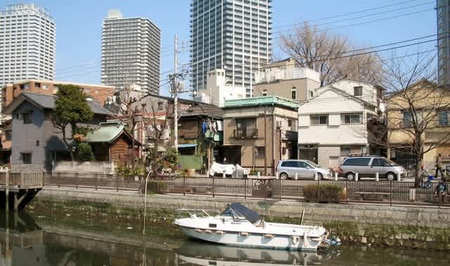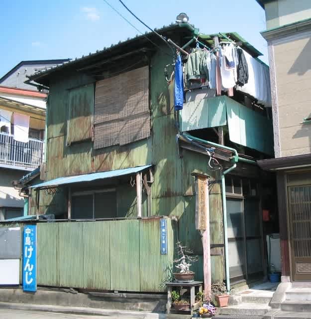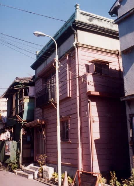 2枚目写真中央に写っているパラペットのある家とその左の家。その間の隙間のような路地を入ると佃天台地蔵尊の社があり大きな銀杏の木も生えていて、なんとなく楽しいスポットである。佃堀側の入り口にある2棟の古い民家は現存するが外壁などを改装した。銅板張りのパラペットのある洋風の家は、2階の窓ガラスが替えられて木の桟ではなくなり、戸袋がなくなってしまった。1階の小さな窓は古い木の桟のまま残してある。