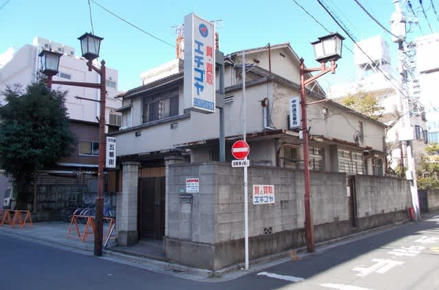 サンロード商店街の南、昭和通りと小岩中央通五番街の間にある質屋。四つ角の角で、その両方の通りの外灯に「中央通五番街」の看板が付いている。大通りの五番街商店街から見ると裏通りと横丁だが、同じ商店街の組織の店が並ぶ通りなのだろう。