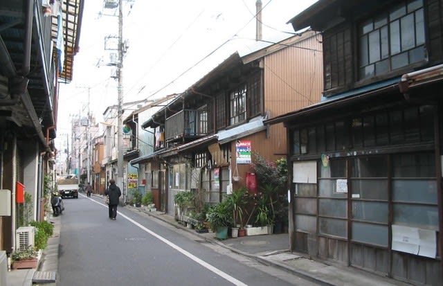 現在は写真右の二軒長屋は取り壊されて駐車場。左の四軒長屋は1軒を残すだけになって、一戸建ての家のようになっている。Googleマップの航空写真には四軒長屋で写っているのでごく最近のことだ。ぼくはなぜか、この長屋を撮っていない。