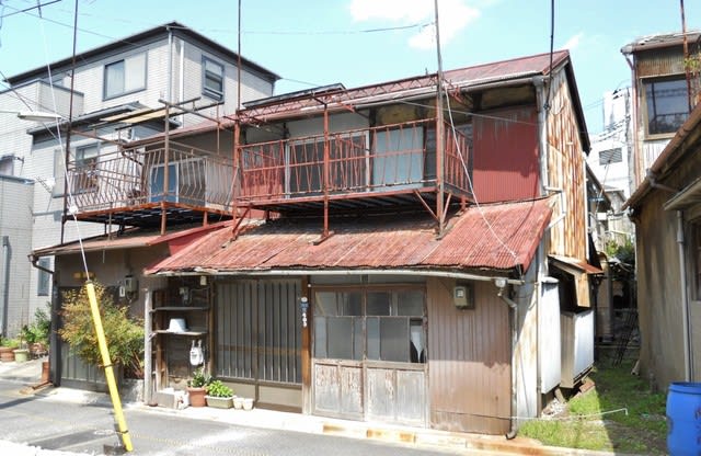 平屋の長屋と同じ路地にある長屋。1階の軒先が食い違っているのは右の家の方が下に垂れてしまったのかと思う。古い航空写真では元は四軒長屋で、写真左の家は長屋の左2軒を建て替えたものらしい。