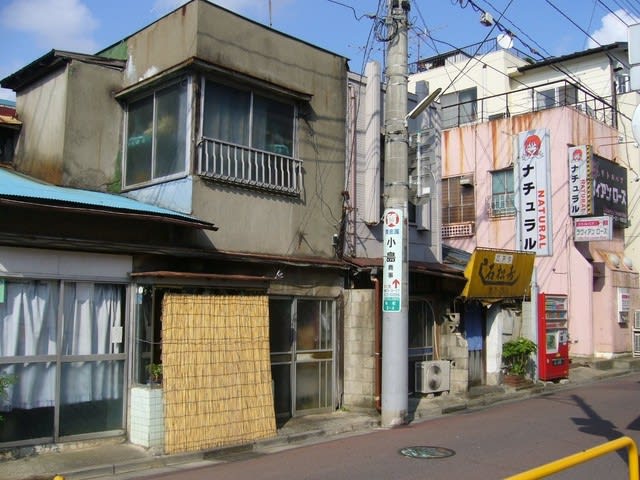 県道沿いの出桁造りの商家は住宅に替わってしまった。正宗は変っていない。横丁を入っところに青いトタンの壁の家があるがその並びを撮ったのが左の写真。2階建ての家は長屋の1階部分を増築して2階建てにしたものらしい。長屋は現在は取り壊されて駐車場になっている。「ナチュラル」というピンクサロンは今も営業している。