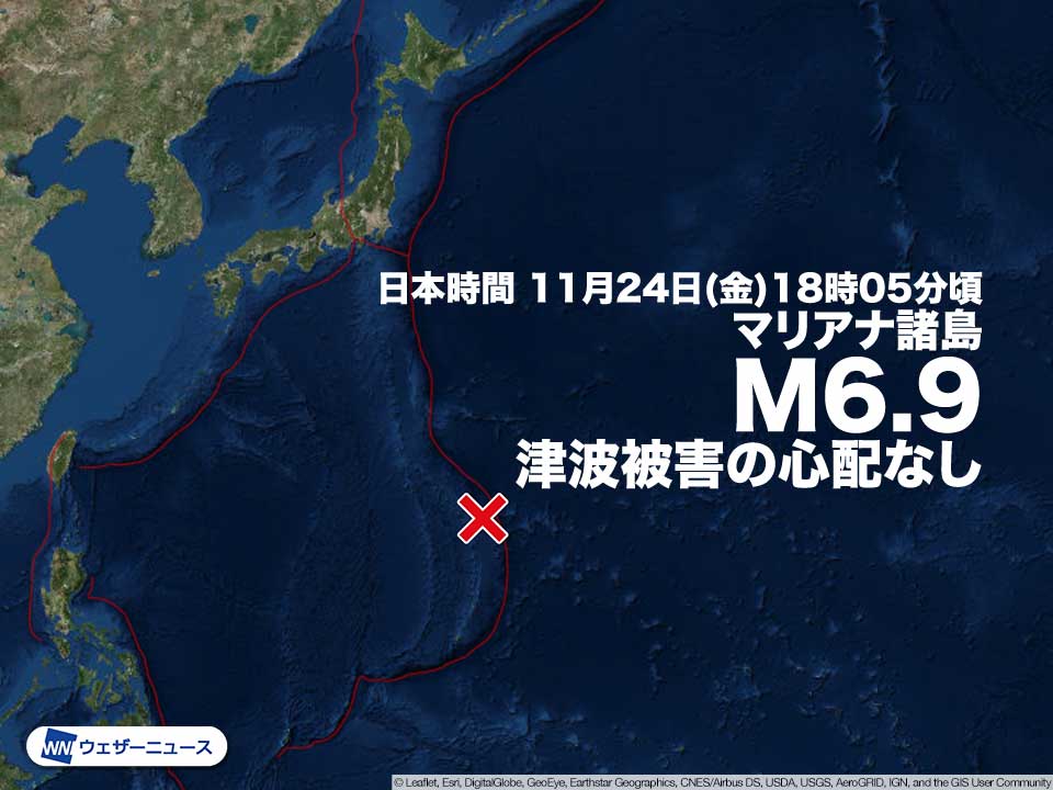 マリアナ諸島でM6.9の地震 津波被害の心配なし【海外地震情報】日本時間の11月24日(金)18時05分頃、海外で地震がありました。震源地はマリアナ諸島で、地震の規模はM6.9と推定されます。この地震による津波被害の心配はありません。※震源は太平洋津波警報センター(PTWC)による。weathernews.jp