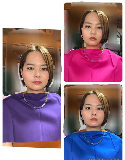 それから本格的に各カラーのドレープを当てて行きます🟦🟥🟪