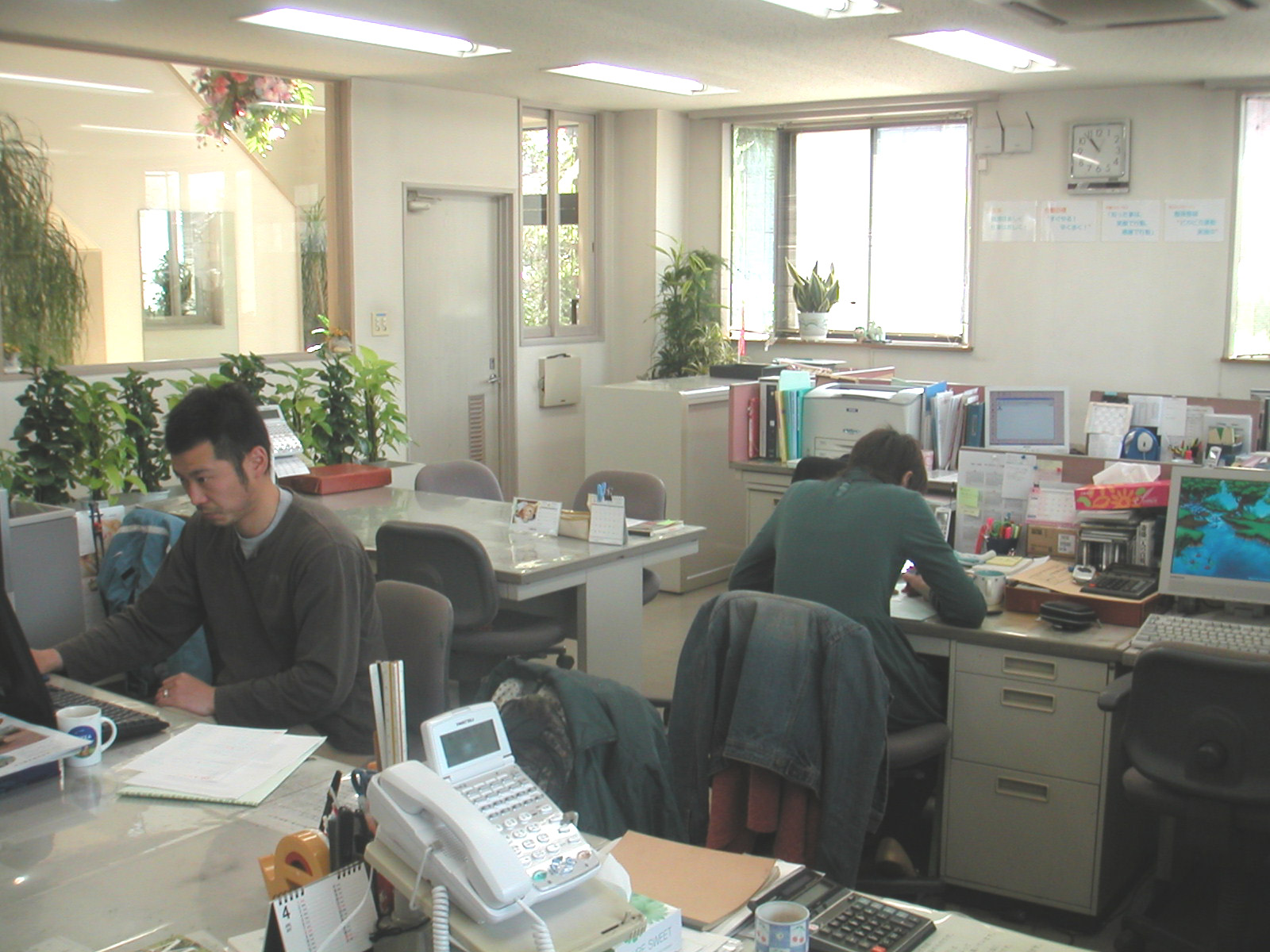 事務所の中・・・今日は、事務所の中をちょこっとお見せします。後ろ向きの女性が実はうちの事務所を明るくする天然事務員のSさんです!恥ずかしいので後ろ向きで失礼しました。普段、事務所の中にはそんなに人がいないんです~。皆、観葉のレンタルや、ガーデニング工事などで出掛けてしまいます。(*´∀`*) そんな事務所ですが、観葉植物を扱う仕事柄結構寄せ植えや観葉鉢が置いてあります。かわいい苔玉もありますよ!!次回 紹介しま~す いろいろと。