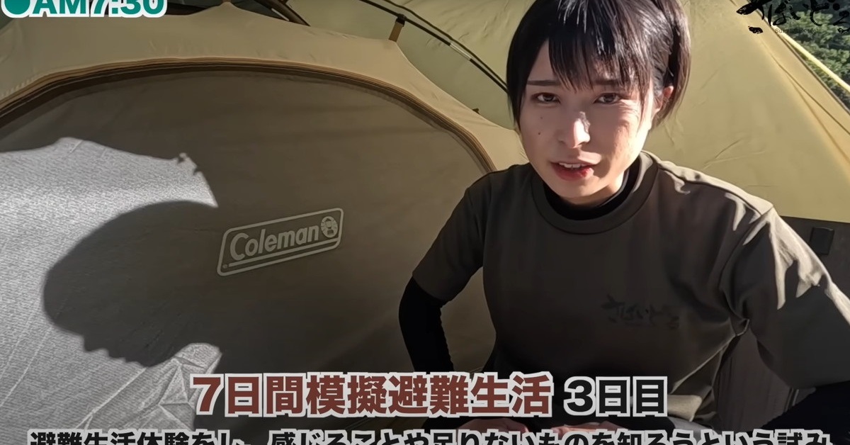 投稿者はサバイバル×アイドルを融合した“さばいどる”として活躍する、かほなんさん。防災士や狩猟免許、重機の資格を持っており、本気で無人島生活を目指しながら、普段は東海地方でライブ活動をしているアイドルです。7日間の模擬避難生活をスタートさせた。