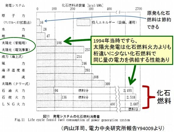 「原子力発電の場合は、運転時にCO2を排出しないため、CO2PTの値が低くなり、これを根拠にクリーン エネルギー(ゼロエミッション)などと呼ばれた。だが燃料の精製や使用済み燃料の処理まで含めると、EPTが何年になるのか全く分からない。現時点で使用 済み燃料のほとんどは、海外の再処理工場に送り出しているだけである。最終処分先も全く決まっておらず、EPTの計算に入れようがない。」