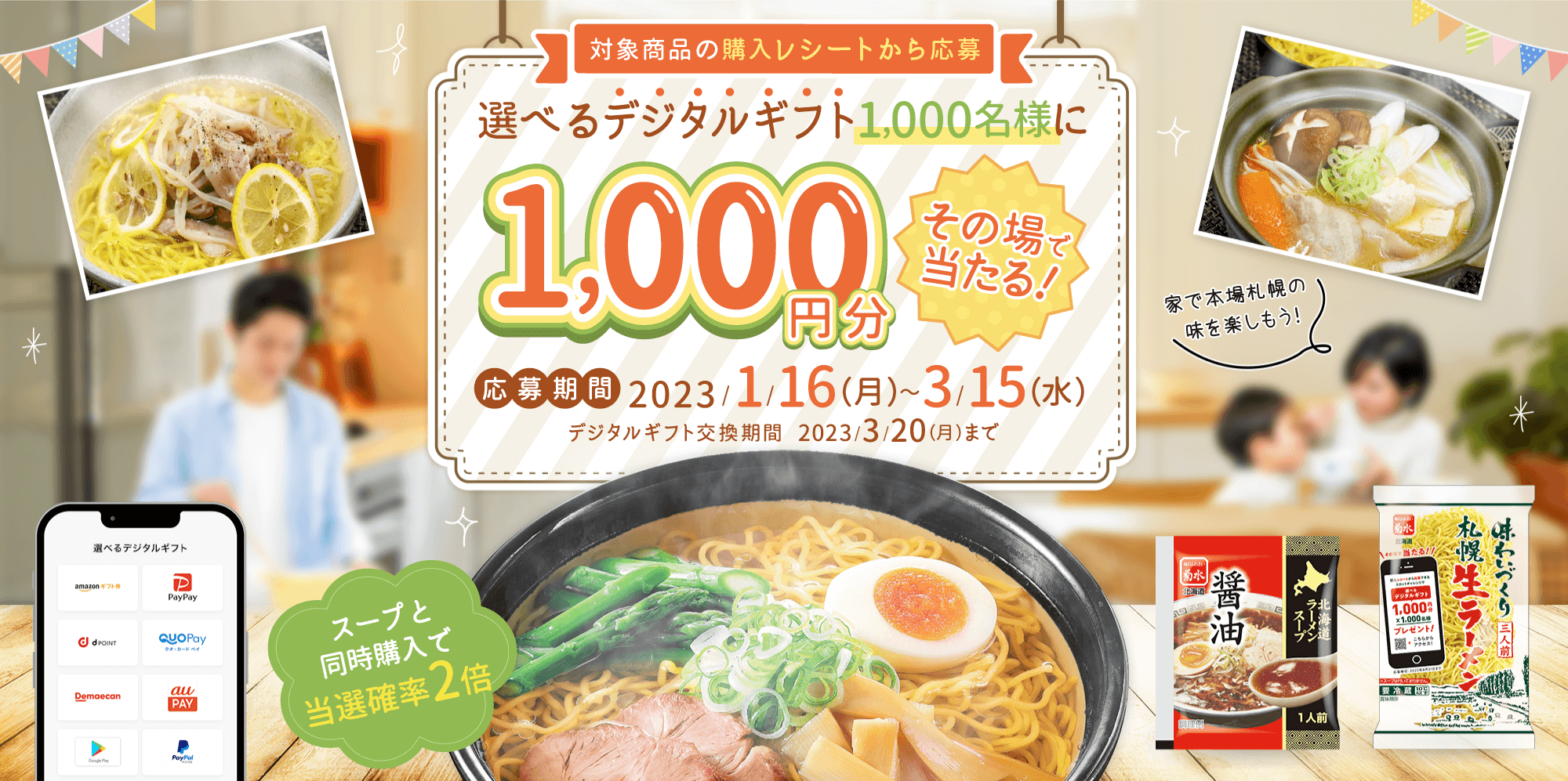 菊水玉麺を買って応募しよう!選べるデジタルギフト1,000円がその場で当たるキャンペーン!菊水 玉麺購入キャンペーンサイト。対象商品をお買い上げ頂いたレシートでその場で当たりがわかるスロットにチャレンジ♪選べるデジタルギフト1,000円分プレゼント!kikusui.campaigns.jp