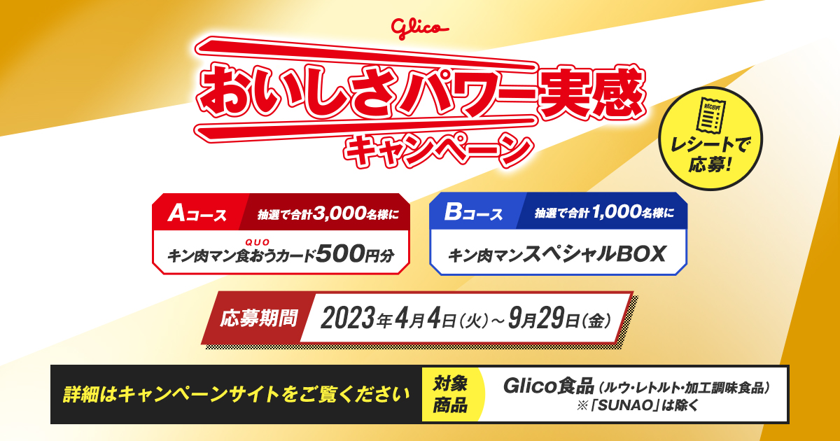 Glico×キン肉マン おいしさパワー実感キャンペーン|江崎グリコ【Glico 食品】Glico×キン肉マン おいしさパワー実感キャンペーン!対象商品を購入したレシートをスマートフォンでアップ、もしくはハガキで送って応募しよう♪抽選でキン肉マン食おう(QUO)カード500円分、キン肉マンスペシャルBOXが当たる!2023年9月29日(金)23:59まで!cp.glico.com