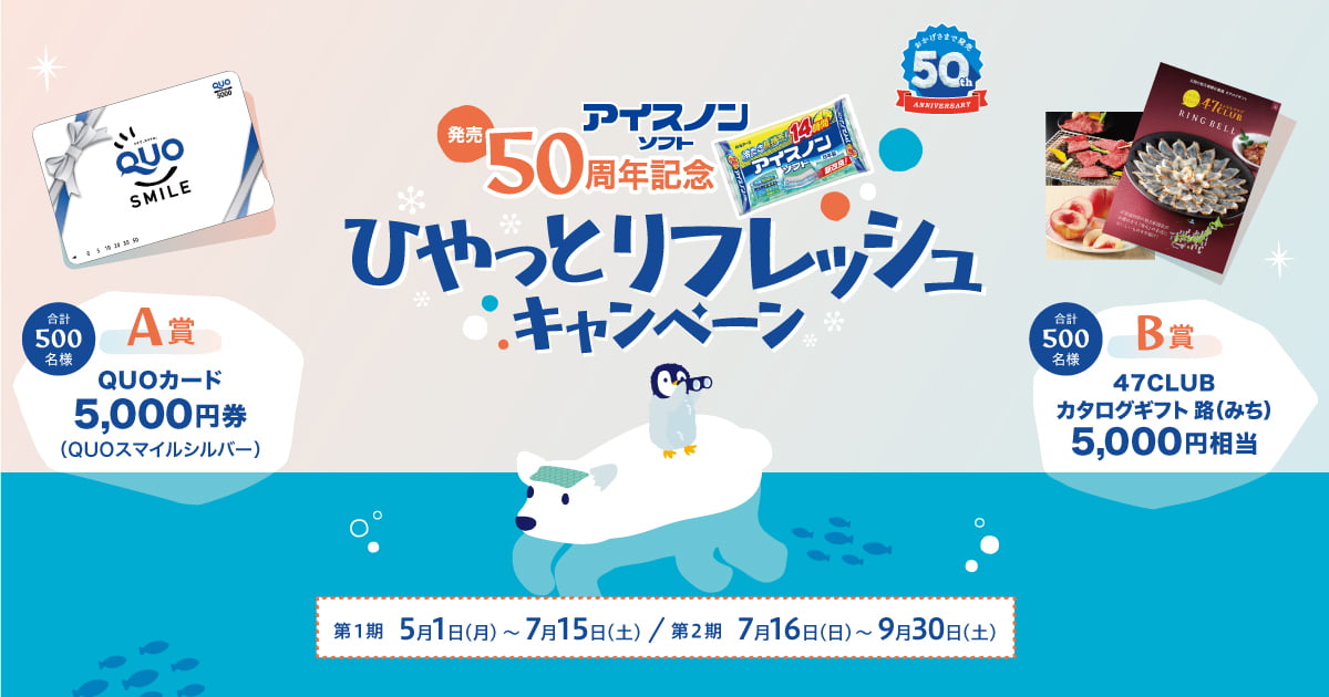 白元アース株式会社 | アイスノンソフト発売50周年記念キャンペーン開催白元アースが提供する衛生用の冷却商品「アイスノン」シリーズ。アイスノンソフト発売50周年記念「ひやっとリフレッシュキャンペーン」を開催します。期間中、対象商品を税抜500円以上お買い上げの方の中から抽選で合計1,000名様に素敵な賞品が当たる。icenonsoft-campaign.jp