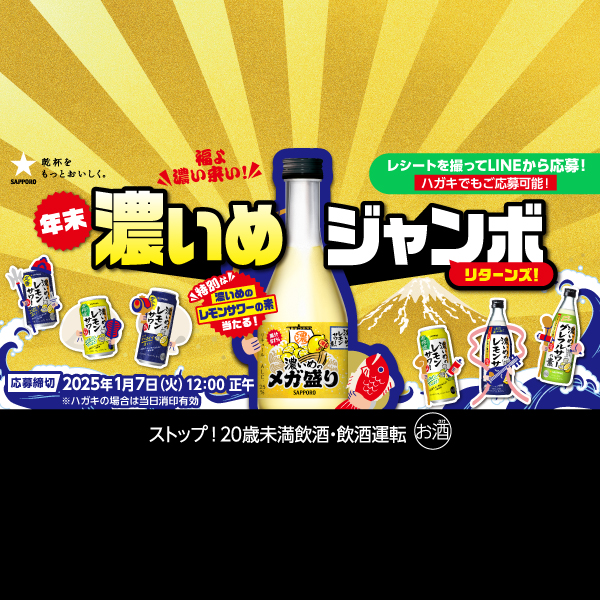 年末濃いめジャンボキャンペーン リターンズ!サッポロ 濃いめのレモンサワーブランド製品を合計500円(税込)以上お買い上げのレシートで応募すると、抽選で「おつまみ福箱セット」または「えらべるPay500円分」が当たるキャンペーン実施中!smart-l.jp
