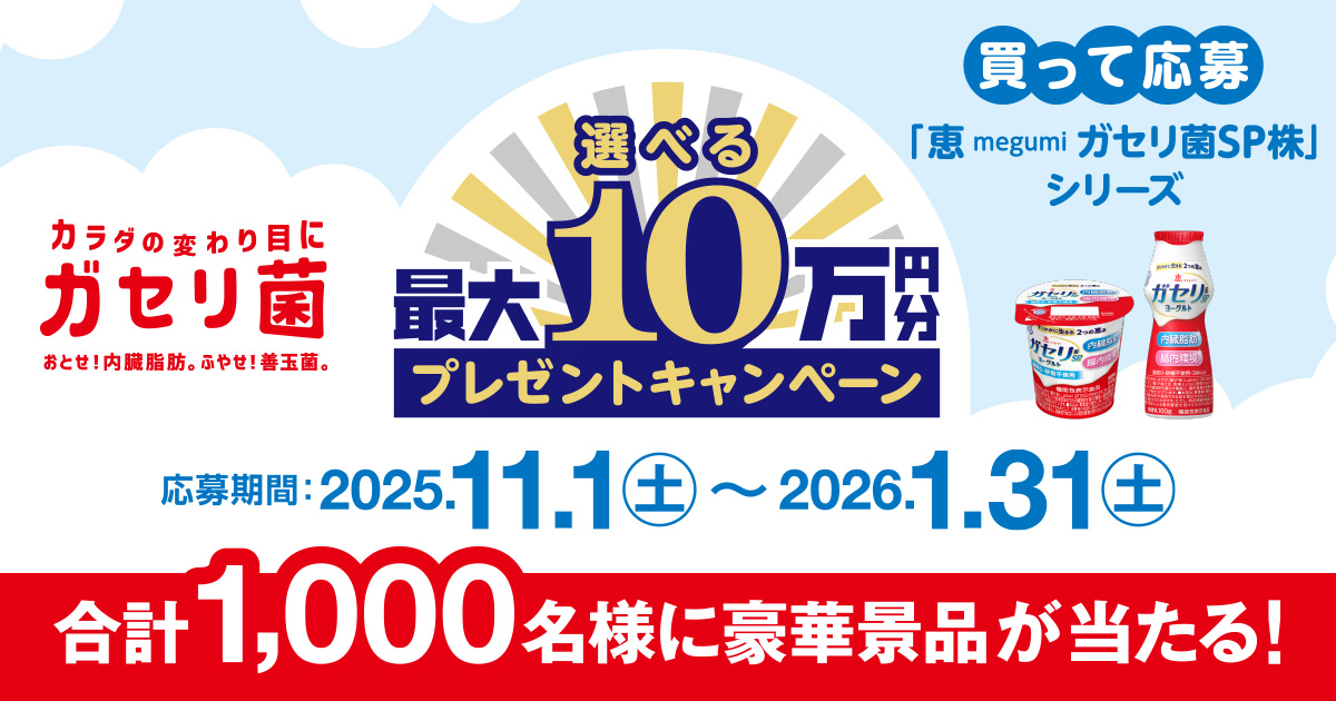選べる最大10万円分プレゼントキャンペーン|恵 megumi ガセリ菌SP株ヨーグルト|雪印メグミルク株式会社選べる最大10万円分プレゼントキャンペーン 「恵 megumi ガセリ菌SP株」シリーズを購入して抽選で合計1,000名様に豪華景品が当たる!www.megumi-yg.com