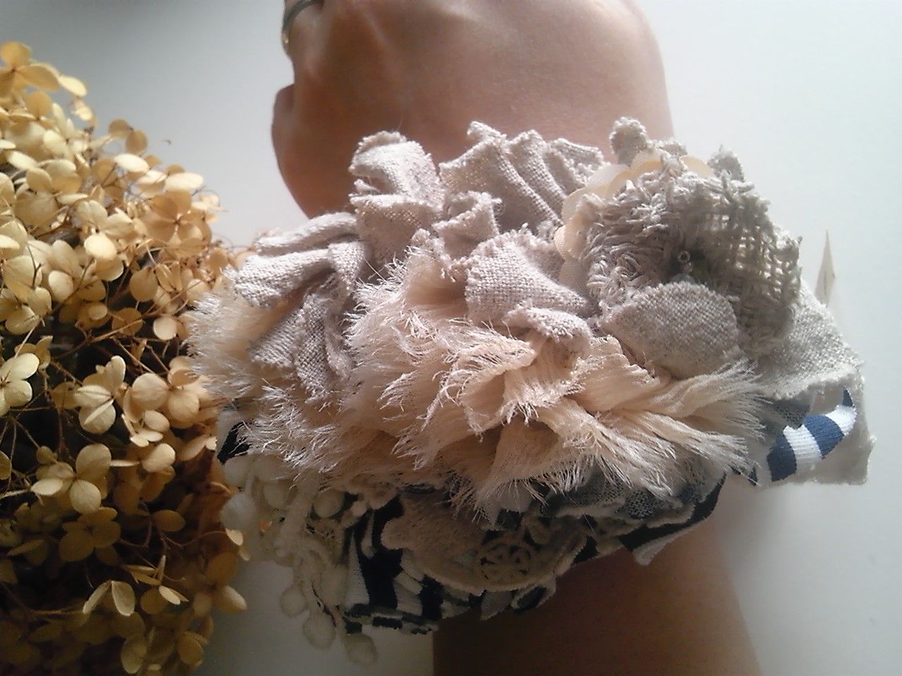 リネンとふわふわのプリーツシルク、レースに、ネイビーとホワイトのストライプ生地でちょっぴりマリンなゴージャスなシュシュ