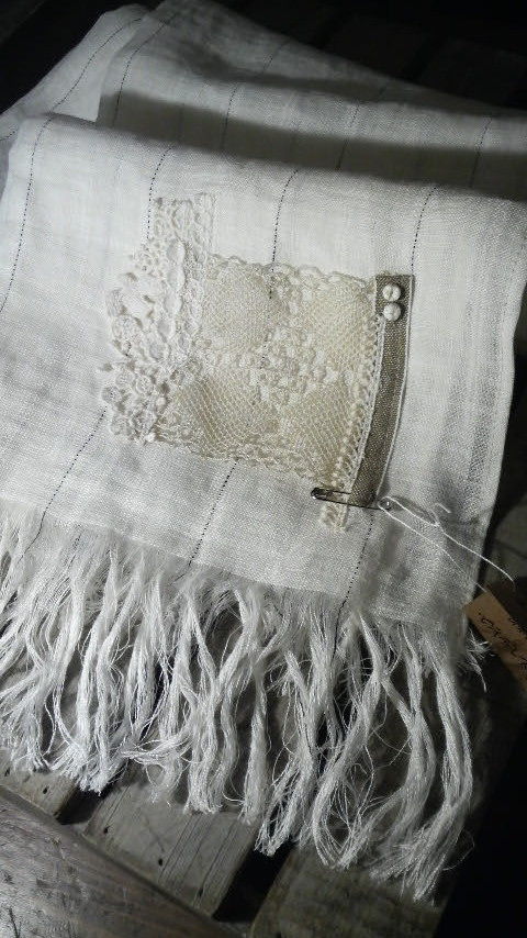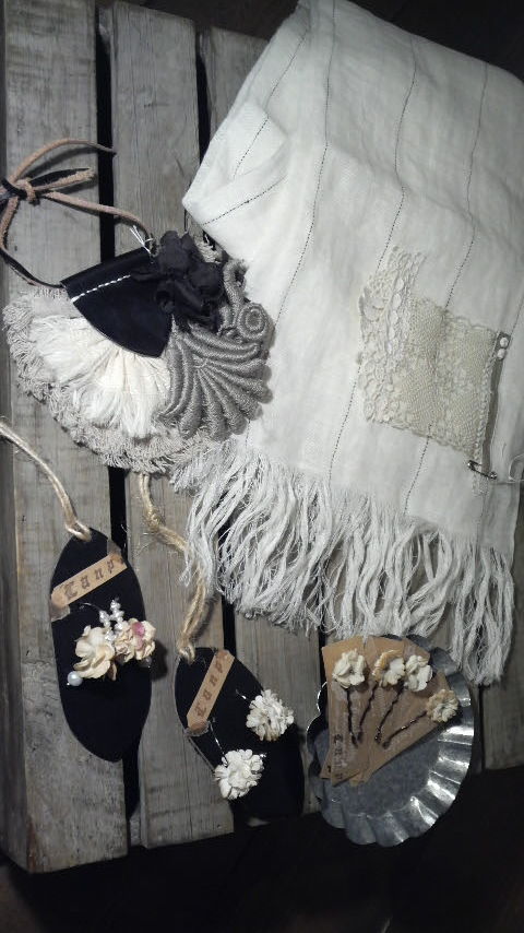 ほぐしたリネン、コットンに、グレーのゴージャスレースと黒い布花、