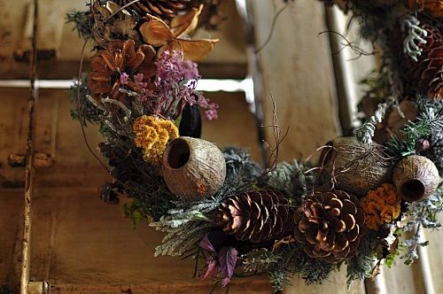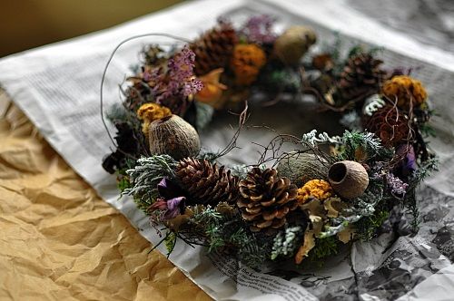 松ぼっくりや森の木の実にお花を添えたとってもナチュラルなクリスマスリースです☆