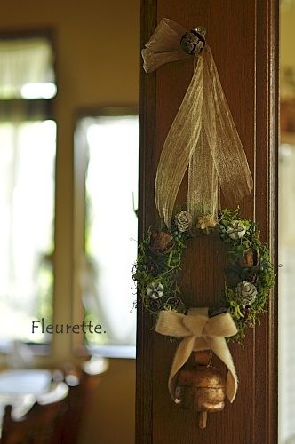 ちいさめのリースに大きなおりぼんと、大きなカウベルのついたかわいいクリスマスリースです