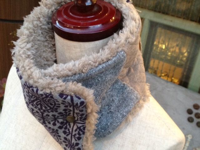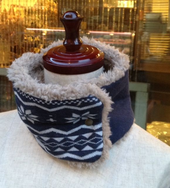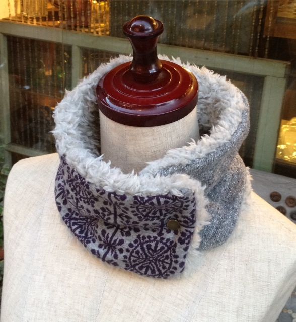 パープルの素敵な雪の結晶柄のニット生地とツィード生地、アラン風ニット生地をパッチしたネックウォーマー。