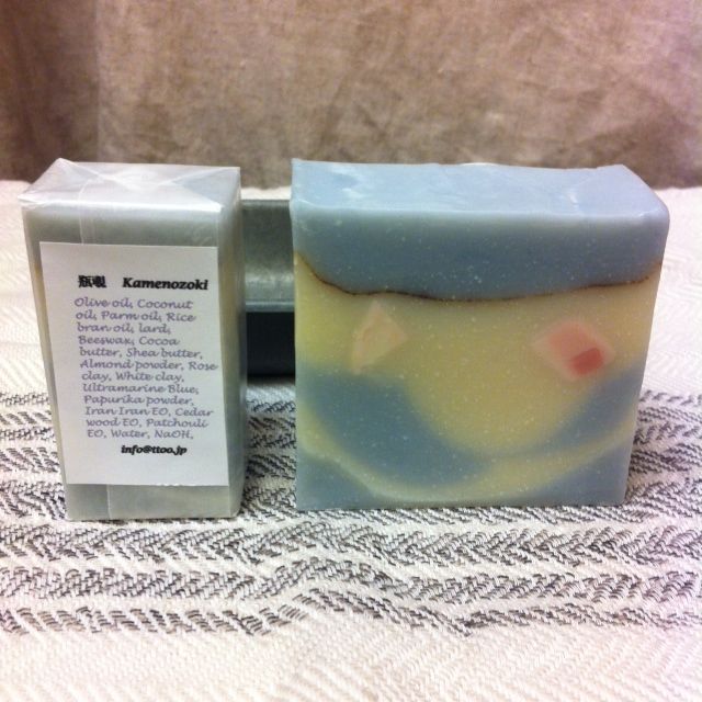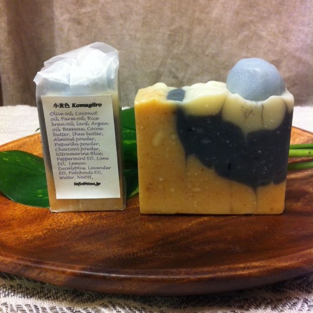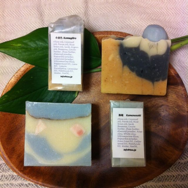 オリーブ油、ココナッツ油、パーム油、アルガン油、米油、ラード、蜜蝋、シアバター、ココアバター、アーモンドパウダー、ウルトラマリンブルー、チャコール、パプリカパウダー、