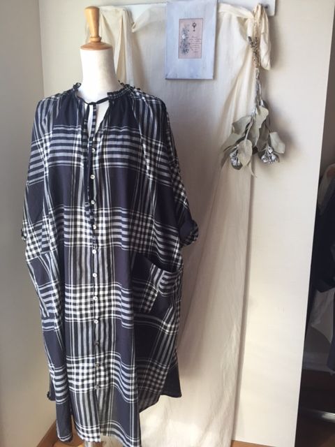 黒にほど近いダークネイビーにアイボリーのチェックはシャツワンピース。