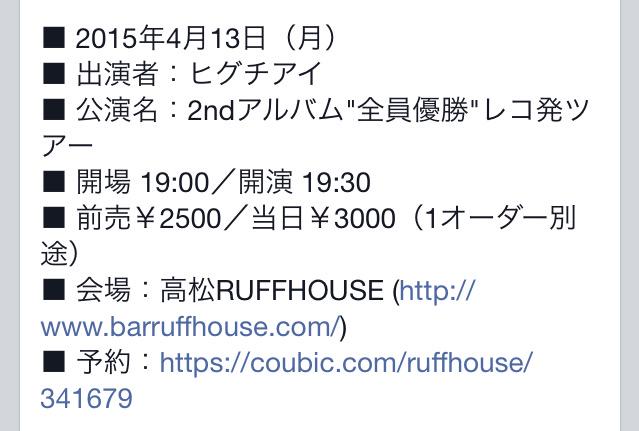 こちらの手違いで明日もワンマンになっちゃいましたー!やばいー!ヒグチアイ誕生の地、香川でワンマン!場所はラフハウスです。ぜひ!