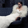 Strapless asymmterical lace bodice with beaded detail. Dupioni skirt with side drape.
