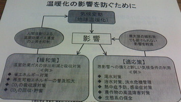 二市二町議会環境保全協議会 研修会 (PDF: 46.75KB) (PDF: 1258.67KB)予定時間(90分間)では全然足りない、熱い研修会でした。テーマ:「地球温暖化と地域への影響について」講 師:兵庫県立大学 環境人間学部 中島 一憲 准教授日本国としては100年間で、年間平均気温1.16℃上昇ですが、神戸では1.29℃上昇。様々な影響が懸念されています。緩和策と適応策の2つの温暖化対策が必要とされています。低排出ガス車の導入・蚊の繁殖を防ぐ等、身近な出来ることから取り組んで行きましょう。
