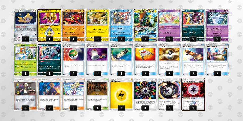 ・ポケモンだいすきクラブ:これ一枚でマーシャド、ジラーチ、サナニンフのどれか2枚に触れることができ初ターンに使用したいカードなため4枚採用になりました。