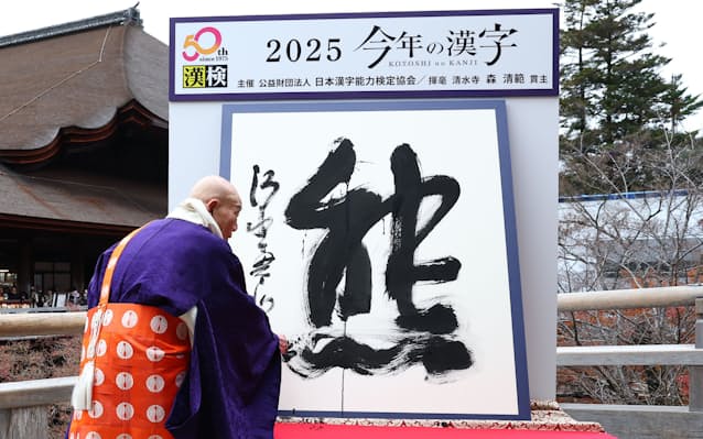日本漢字能力検定協会は12日、2025年の世相を1字で表す「今年の漢字」が「熊」に決まったと発表した。各地で出没と人的被害が相次いだのに加え、漢字で「熊猫」と表記されるパンダの中国返還にも注目が集まったとした。京都市の清水寺で、森清範貫主が縦約1.5メートル、横約1.3メートルの和紙に揮毫(きごう)した。