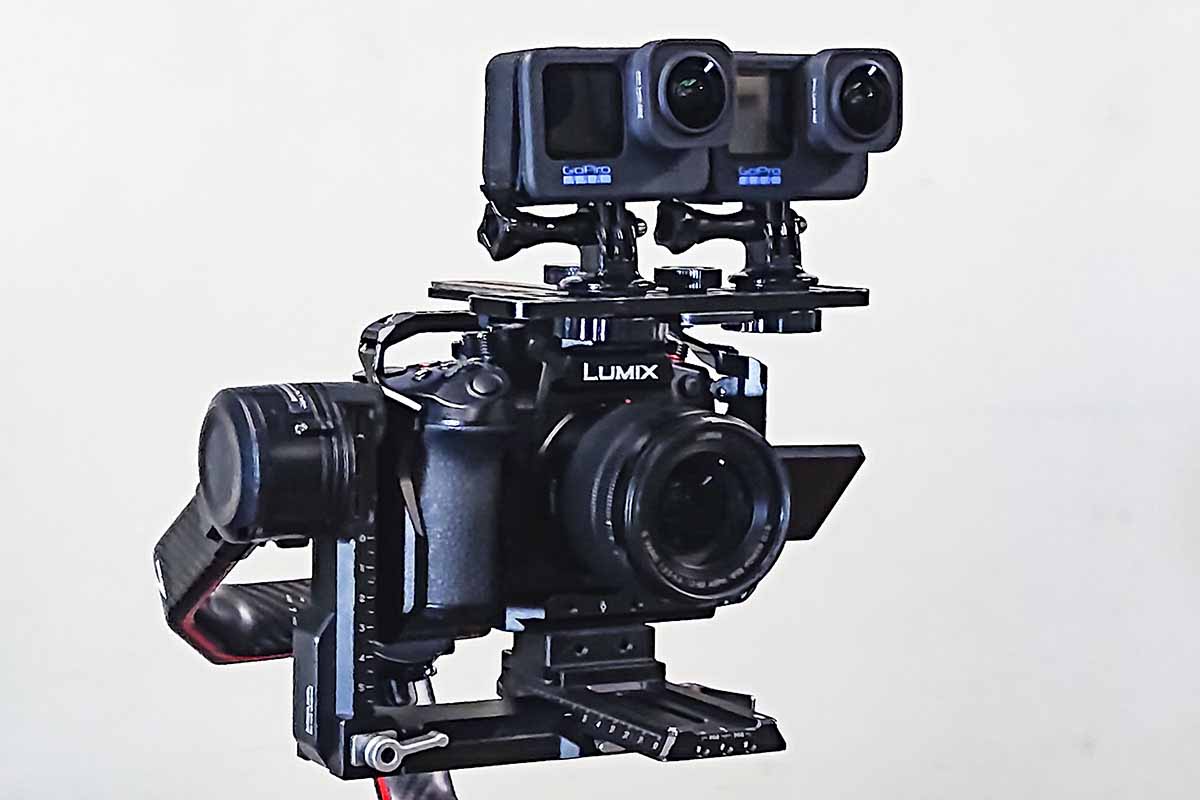 上の画像は、Panasonic Lumix DC-GH6 の上に VR180用にセットしたGoPro Hero11 Black2台を乗せ、それをジンバルに乗せたセットです。