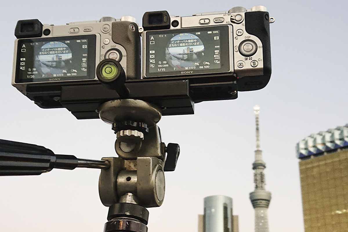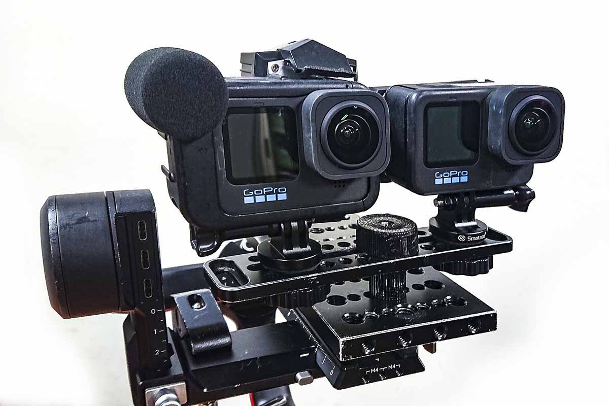 上の画像は、2台横に並べたGoProをジンバルに乗せたものです。