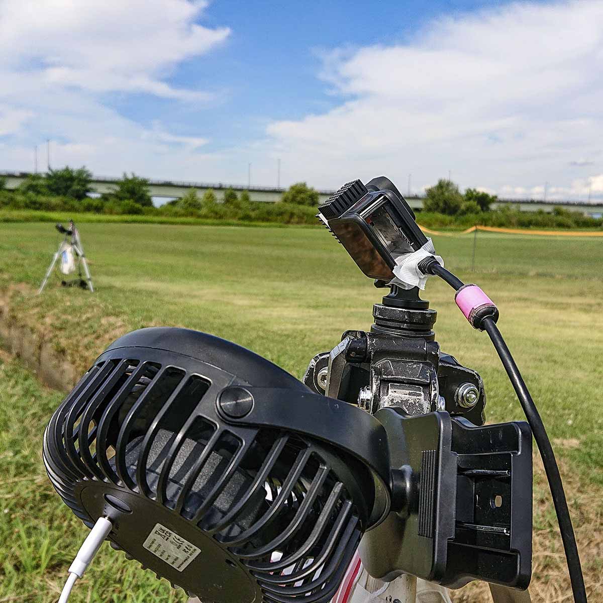 約2時間に渡る花火大会の全プログラムを連続撮影する為に、つまり、熱暴走を防ぐ為に、 GoPro Hero11 Blackから内蔵電池を取り外し外部電源からUSB給電、 ヒートシンクをボディに張り付け、小型扇風機から風を送り、空冷しながら2時間以上の連続撮影をした時のセットです。