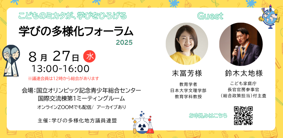 このたび、私も関わらせていただいている「学びの多様化地方議員連盟」が、記念すべき設立1周年を迎える節目として、以下のとおりフォーラムを開催することになりました。