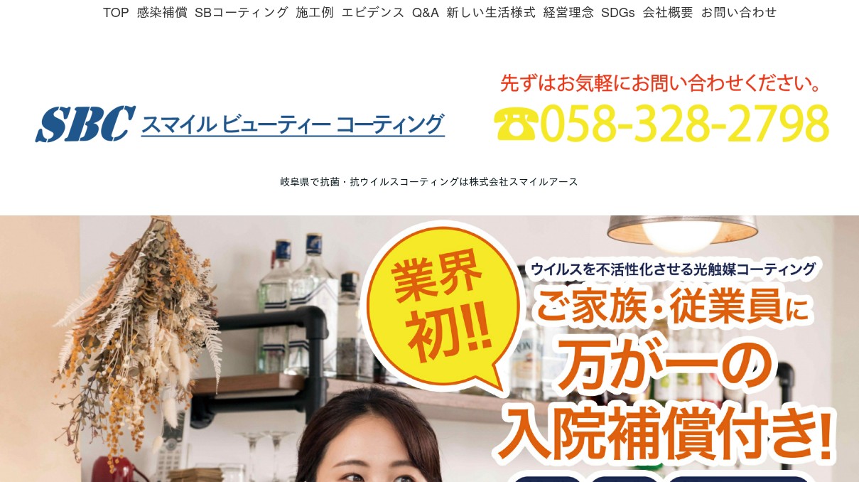 岐阜で感染補償付き抗ウイルスコーティングならスマイルビューティーコーティングSBC岐阜県で抗菌・抗ウイルスコーティングは株式会社スマイルアースにお任せください。弊社の光触媒 抗菌・抗ウイルス コーティングは、ご家族・従業員に使える新型コロナウイルス感染補償付きです。www.smileearth-coating.com