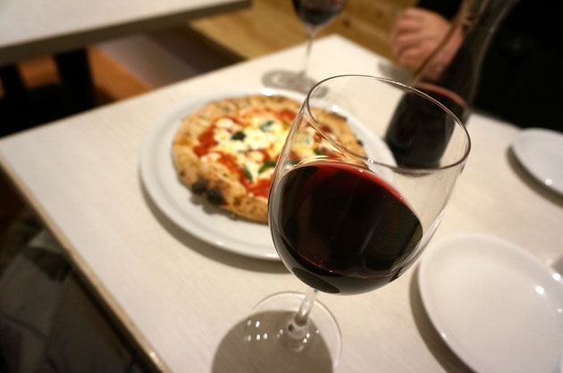 大きさはちょっと小ぶりで、これならばお酒のおつまみとしてちょうどいいかな。ビールもありますが、やはりワインを。ハウスワインのデキャンタ(1,200円)を。サリーチェ・サレンティーノなど南イタリアのボトルワインもいくつかあり、一本2,000円台。座って飲めるしおつままみになるピザや一品料理もリーズナブルですから、これは地元の人がうらやましいです。