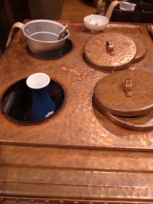 飲み物は、瓶ビール中(550円、サッポロ赤星)、シャリキンホッピー(350円、なか150円)下町ハイボール(400円)など。そして、席の前にあったのが、この日本酒を温める器具。冬は最高だと思います。あとメニューに、例えば弁天娘なら松田聖子、杉勇なら江角マキ子、竹鶴なら樹木希林みたいに、日本酒を女優に例えて書いていて面白いです。日本酒は全て7勺で600円。