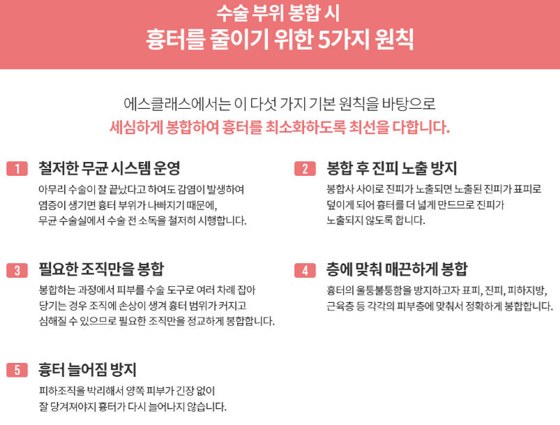 エス・クラスでは、この5つの基本原則に基づき、細やかな縫合を行い、傷跡を最小限に抑えるよう最善を尽くします。