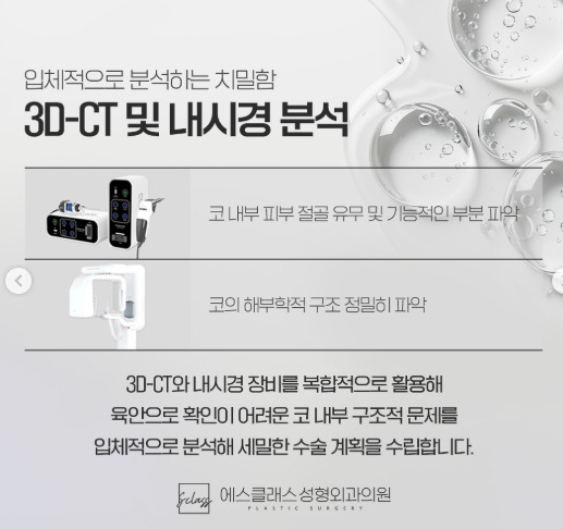 エス・クラス整形外科では、3D-CTと内視鏡を活用し、鼻の内部を立体的に分析した後、女性の整形外科専門医がオーダーメイドの鼻整形プランを立てます。