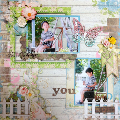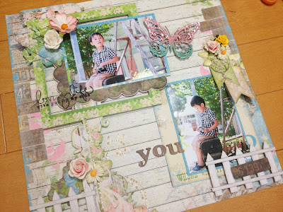 you今日は汗ばむくらい暖かい日でしたね。 でも、明日は寒いみたいです。 季節の変り目は風邪を引きやすいので注意しなくては!! 子供達の喘息も出そうなので心配です。 新作のペーパーもたくさん購入したのですが・・・ひらめきがなく苦戦。 やっと出来上がった作品です。 写真は去年、プロカメラマンの苺畑さんにcafeで撮って頂いたものです。 (作品を夜に撮影したので、画像が暗いし照明でテカッてしまいました・・・。) いつもの柵をつけました。 ペーパーは爽やかで夏の印象を私はうけたのですが、春の写真でも合いそうですね。 今日もお付き合いありがとうございました