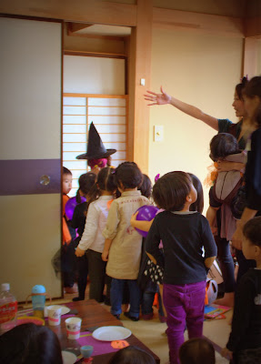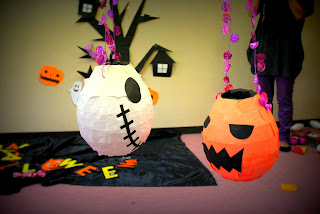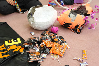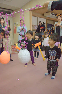 お菓子が詰まったかぼちゃとお化けの「ピニャータ」を、子どもたちが棒でたたいて壊しました♪