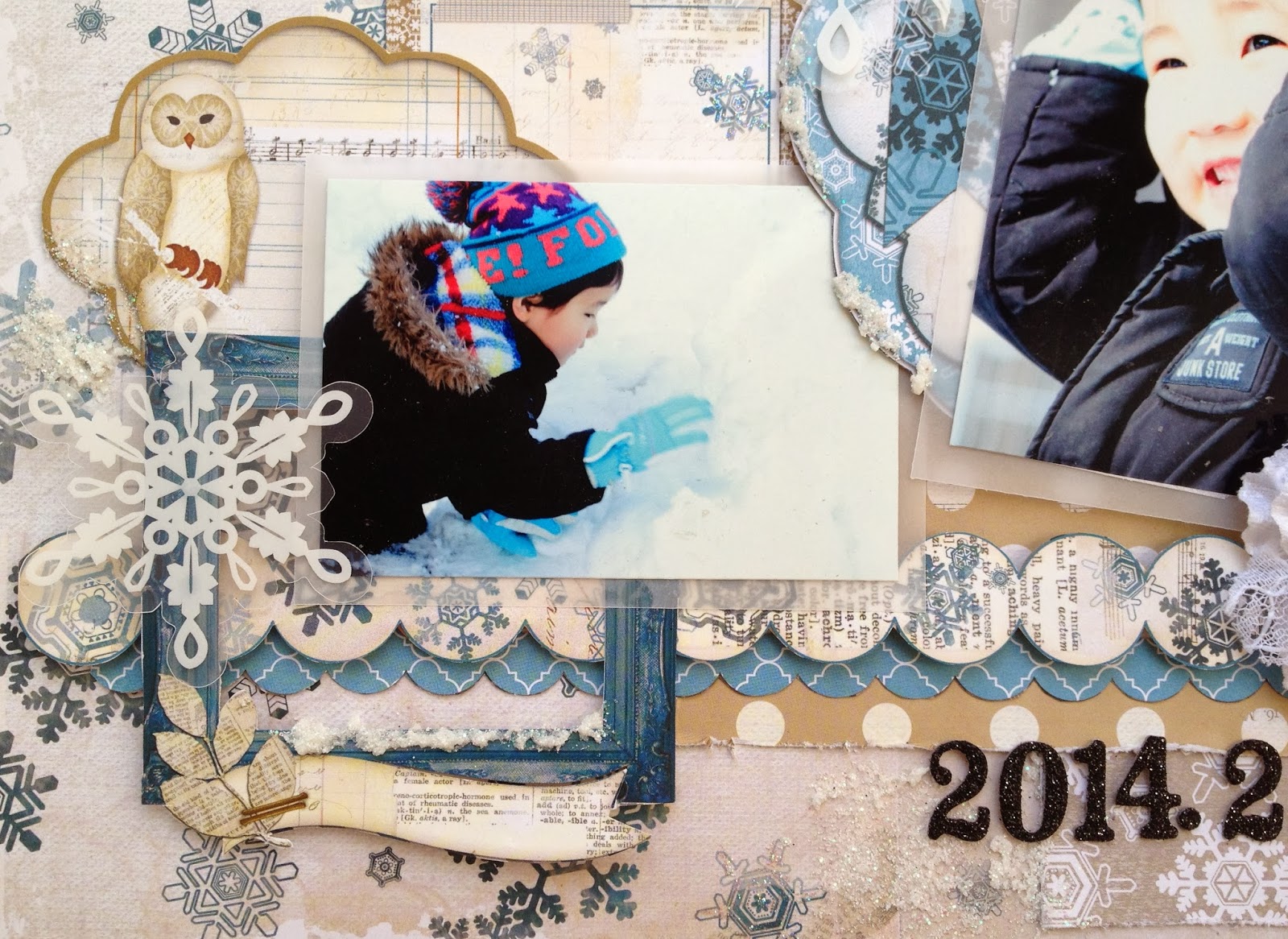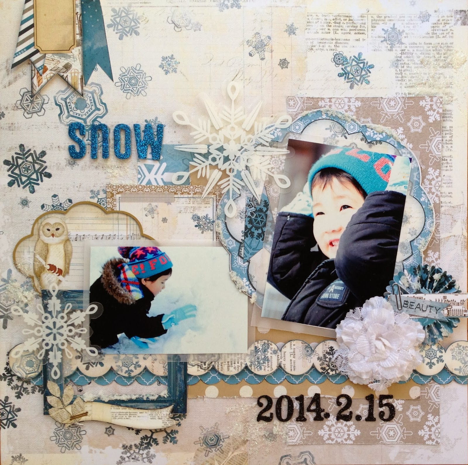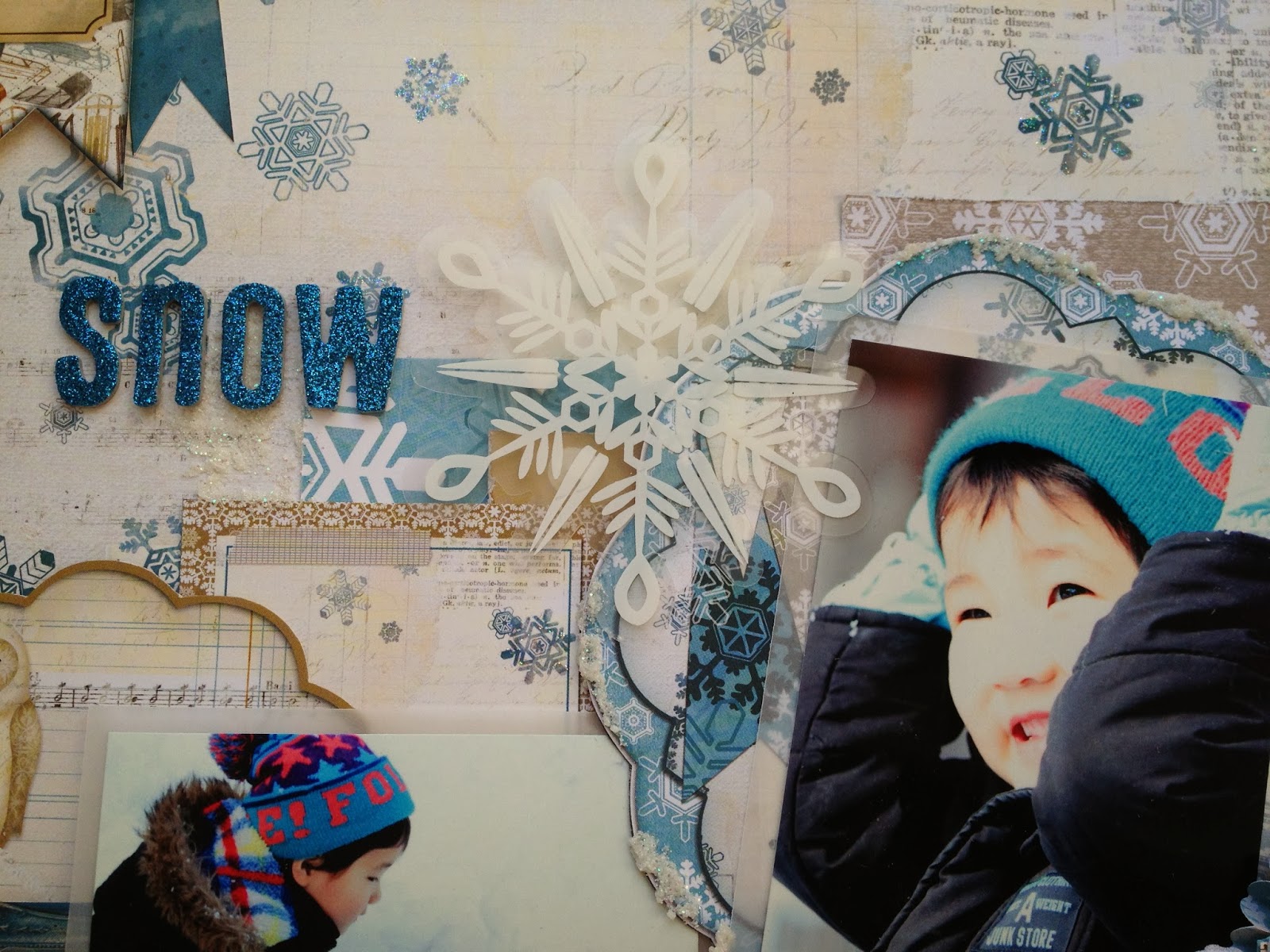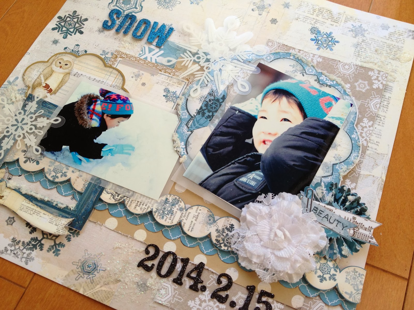 大雪先週は20年ぶりの大雪になり、一面銀世界でびっくりしましたね。 週末に予定されていた、幼稚園行事も中止になりとっても残念でしたが 子供たちは滑り台やかまくらをパパに作ってもらい大喜びで遊んでました♪ そんな雪の写真を使って作りました! オーバレイの雪の結晶やべラムを使って透明感を意識しながら、 キラキラ光る雪をイメージしてグリスニングスノーテックスをペーパーに塗って タイトルもラメが入ったものにしてみました。 この記録的な積雪を忘れないように、日付も入れてみました。