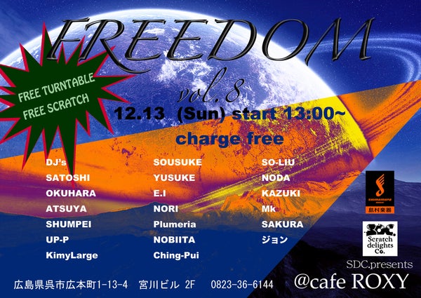 FREEDOM! 12月13日(SUN) 13:00~??入場無料🎵cafeROXYにてFREEDOMやります!今回はDJが最多の19人⁉︎DAYイベントになりますのでお昼からお酒片手に、お店の名物ROXYバーガー食べながらゆったりした時間過ごしませんか?しかも、ターンテーブル2セットある内の1セットがフリーなのでスクラッチ飛び入り参加も出来ます👍楽しい時間を一緒に過ごしましょう🎵お待ちしてます😄 via SDC. (Scratch Delights Co.) Your own website, Ameba Ownd