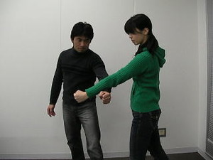 そして自分は足を前後に開いて立ち、その腕を上から力を入れて下ろそうとします